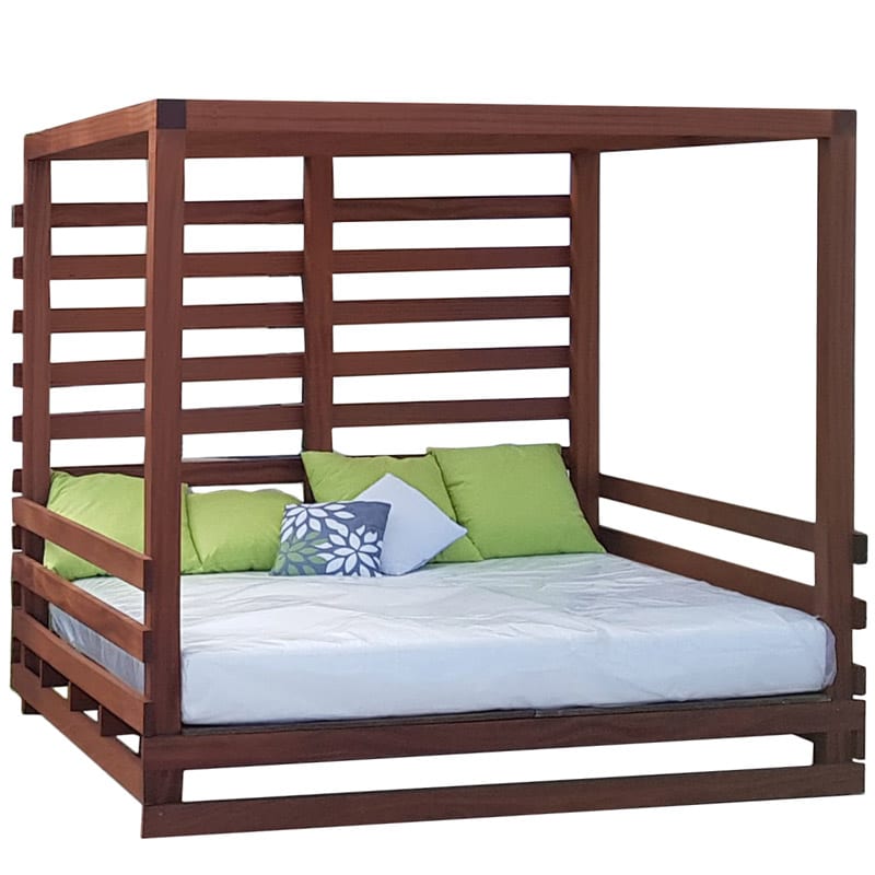These modern and comfortable structures are available in highly durable square iroko or pine wood and include a custom-made mattress, a pillow and two cushions.