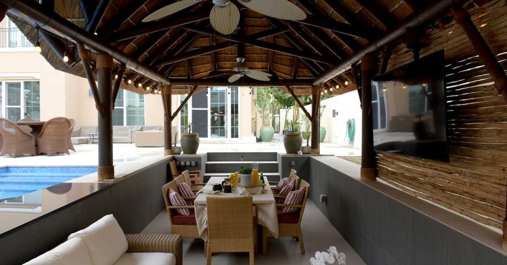 The garden that surrounds this thatched outdoor living space is a vital part of its charm. Lush greenery and towering palms create a tropical, serene environment that transports you to another world. The sound of rustling leaves and the sweet scent of summer in the air add to the sensory experience, making this outdoor area a true sanctuary. Whether you’re hosting a gathering or enjoying a quiet morning alone, the peaceful garden provides a lush, natural backdrop to the boho-themed space.